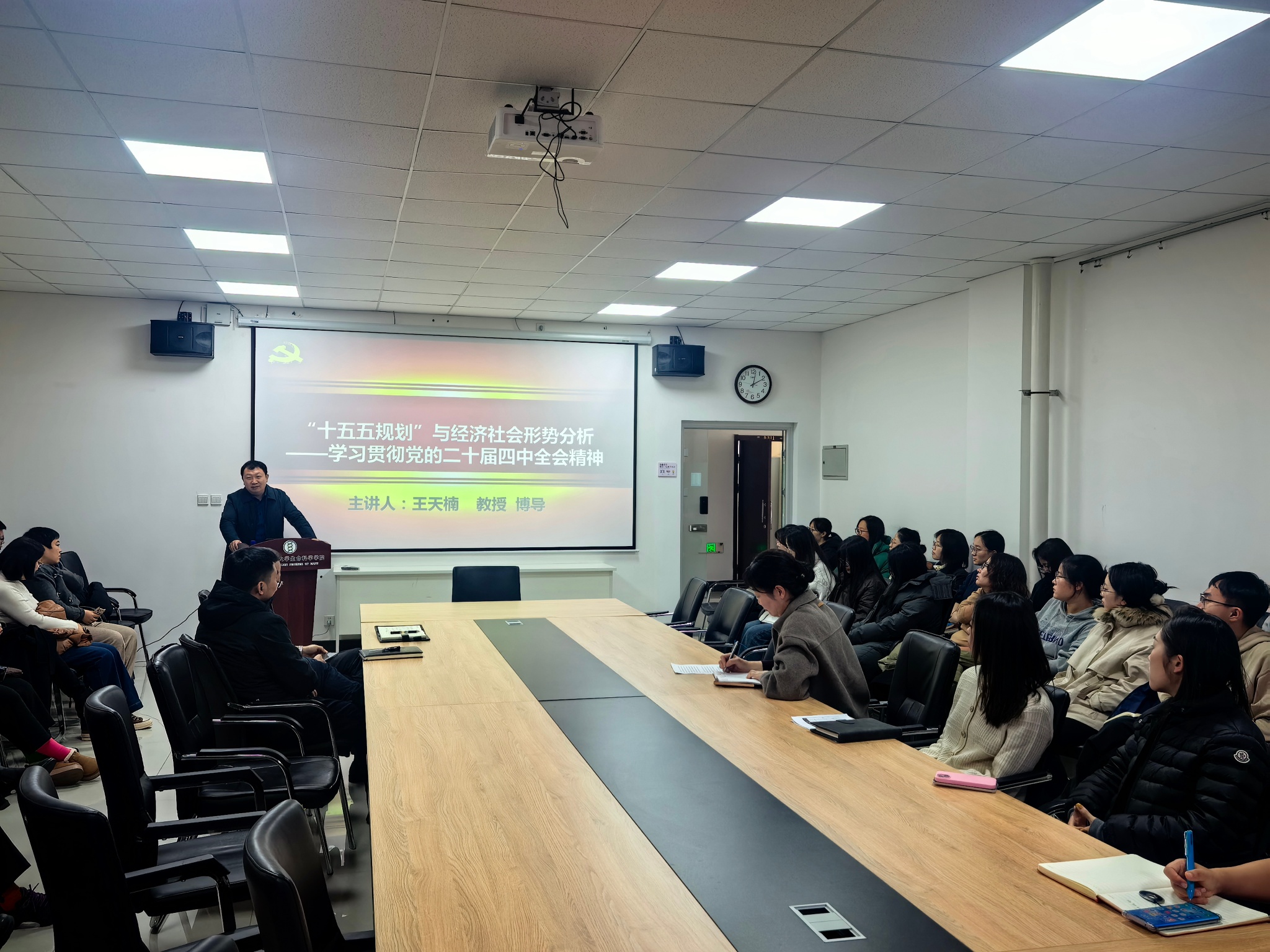 作为辽宁省科学社会主义学会副会长、辽宁省人大常委会机关理论与实践智库专家,王天楠教授曾长期在中共辽宁省委党校从事党的理论与实践研究工作,具有深厚的理论功底和丰富的宣讲经验。报告会上,王老师紧扣党的二十届四中全会核心要义,以“科技闯关、投资于人、全国统一大市场、国家安全屏障”四个关键词为脉络,对全会精神进行了系统解读和深入阐述。