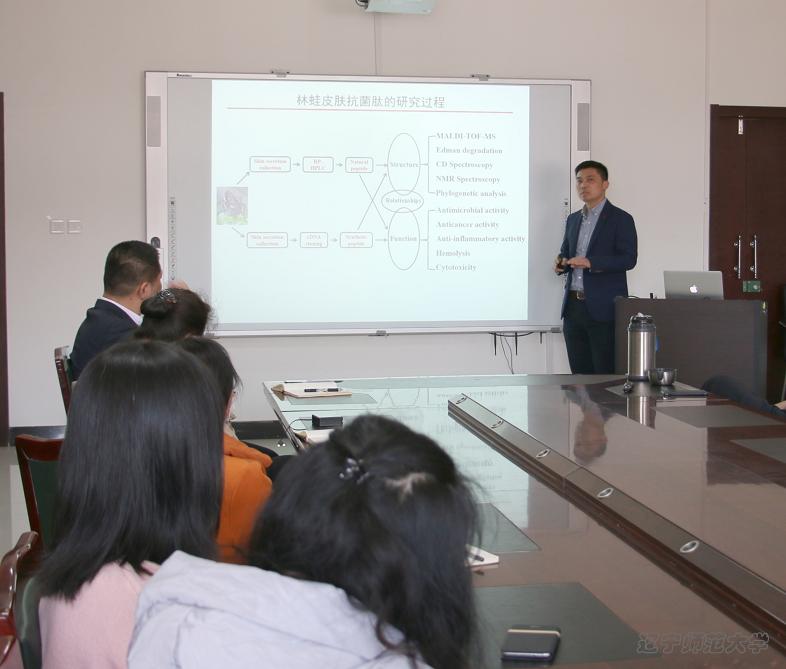 论坛的另一主角登场,董维兵教授从实验的研究背景入手,着重阐述抗菌肽是生物体产生的一类具有广谱抗菌、抗病毒、杀寄生虫、抗肿瘤等活性的小分子多肽的总称,是宿主天然防御的重要参与者,在先天性免疫和获得性免疫中发挥重要作用。围绕其研究团队前期从林蛙皮肤抗菌肽中分离纯化、并改造得到了一种抗菌肽chensinin-1b,研究其构效关系,在此基础上对其结构进行修饰改造,考察各类似物在杀菌、抑癌等生物医药方面的应用。