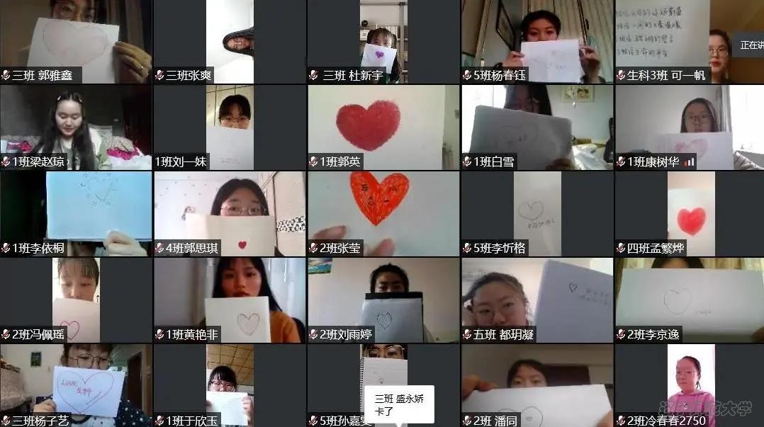 活动要求同学们在纸上画出一个适当大小的爱心图案,可以增加其他文字,马老师选中了一位同学进行指挥。同学们在听到指令后要在屏幕前展示自己的爱心,并由指挥的同学进行截屏。同学们用心做画后,完成了作品的展示与截图,留下了美好的回忆。