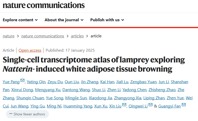 1月17日,球友会七鳃鳗研究中心逄越课题组联合青岛华大基因研究院范广益团队在国际知名期刊《Nature Communications》(IF:14.7)在线发表题为“Single-cell transcriptome atlas of lamprey exploring Natterin- induced white adipose tissue browning”的论文,绘制并解析了全球首个雷氏七鳃鳗(Lethenteron reissneri)的全组织单细胞图谱,结合体内功能研究,探讨了NATTERIN介导铁依赖性的白色脂肪棕色化作用机制,为理解脊椎动物早期祖先的细胞类型及七鳃鳗活性分子的药物研发提供了新思路。