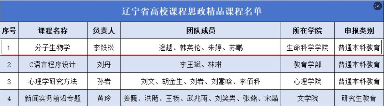 近日,辽宁省教育厅公布了辽宁省高校课程思政精品课程评选结果,球友会共有4门课程入选,其中球友会《分子生物学》课程凭借鲜明的思政特色和突出的育人成效,成功获评省级课程思政精品课程,为球友会课程思政建设树立了新的标杆。
